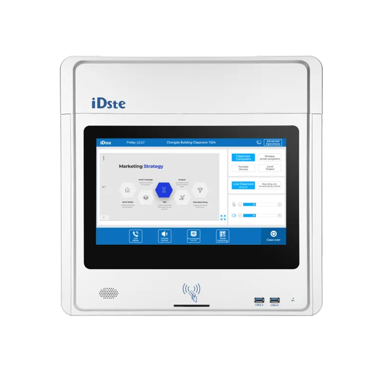 (2)Audio and video encoding and streaming capabilities, with the system platform and applets to achieve live classroom functions. Integrated 14-inch industrial high-definition LCD touch screen; Integrated IP intercom module, support IP call, remote monitoring and other functions. Support the display screen one-key power on/off device, volume adjustment, and environmental control. The built-in recording and broadcasting module supports 6-channel IP video stream acquisition, supports remote control recording and broadcasting of the system platform, and is compatible with fusion terminal signal acquisition.